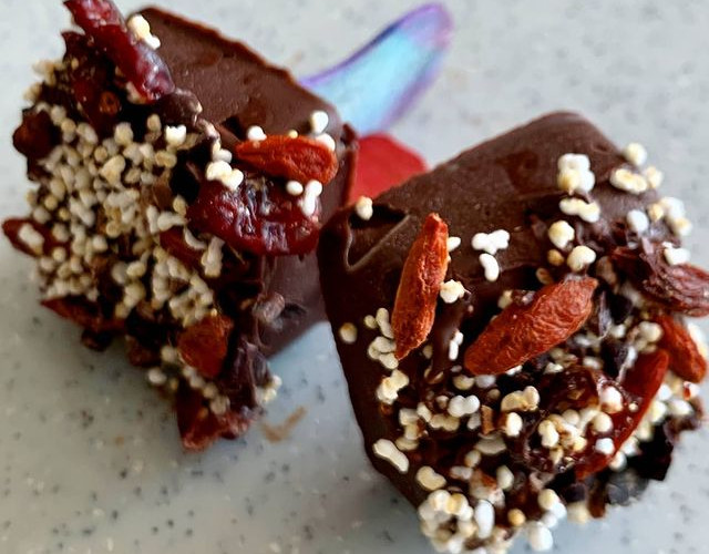 Al día siguiente derrite un poco más de chocolate y báñalos un poco y pasa por un plato con los Toppings de tu elección. Puedes ser nueces, semillas, chochitos...